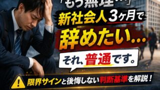 仕事新社会人が3ヶ月で辞めたいのは普通?限界サインと後悔しない判断基準 新社会人で「3ヶ月で辞めたい」と悩んでいませんか?本記事では辞めるべき人の特徴・限界サイン・後悔しない判断基準を解説。実際の離職率データをもとに、今すぐ取るべき行動までわかります。 2026.03.24仕事悩み