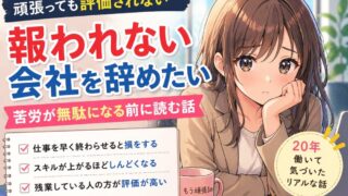仕事頑張っても報われない会社を辞めたい|20年働いて気づいた”損する人”の共通点 仕事を早く片付けるほど損をする。スキルが上がるほどしんどくなる。そんな会社にいつまでいますか?20年間会社員として働いた筆者が、「頑張ることをやめた」経緯と転職という選択肢を正直に話します。 2026.04.25仕事悩み