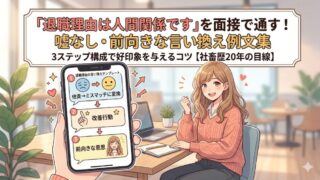 仕事退職理由「職場の人間関係」の面接での伝え方|NG例と使える例文5パターンを解説 退職理由が職場の人間関係でも面接で落ちない伝え方を解説。上司・同僚・パワハラ・社風など5ケースの例文つき。「人間関係です」とそのまま言うとNGな理由と、前向きな言い換え術を社畜歴20年が本音で解説します。 2026.04.02仕事悩み