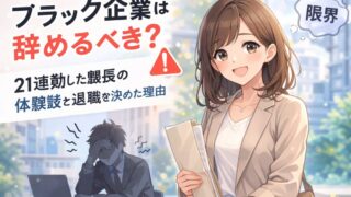 仕事ブラック企業を辞めた体験談|21連勤した課長がボーナス減額で限界を超えた話 21連勤・残業月100時間超え・労基通報——それでもボーナスは減額でした。課長職でもブラック企業は容赦なかった。限界を超えて退職届を手渡しした筆者の実体験と、辞めて正解だった理由を書いています。 2026.04.18仕事悩み