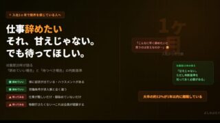 仕事新社会人が仕事辞めたいと思う1ヶ月目【甘えじゃない】原因と後悔しない判断基準 「入社1ヶ月で仕事辞めたい…甘えなのか」と悩む新社会人へ。社畜歴20年が正直に語る、辞めていい場合・続けるべき場合の判断基準と今すぐ楽になる対処法を解説します。 2026.03.22仕事悩み