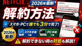 お役立ちNetflixの解約方法【2026年最新】スマホ・PC別の手順と解約できない時の対処法 Netflix 「Netflixを解約したい」という人へ。PC・iPhone・Android別の解約手順をわかりやすく解説。解約ボタンが見つからない・解約できない時の原因と対処法も紹介。解約後いつまで見られるか・アカウントはどうなるかも全部まとめました。 2026.03.19お役立ち