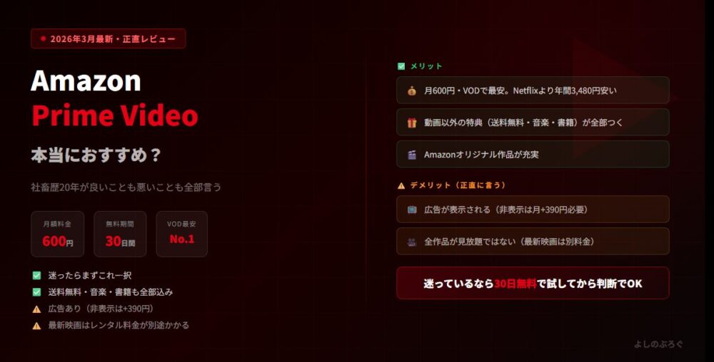 - 月600円・30日無料・Prime特典すべて込み。コスパは主要VODで最強